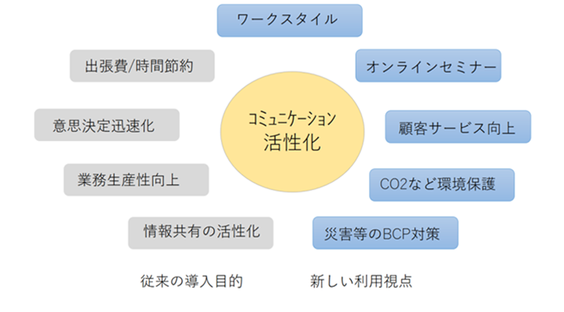 他社事例Web会議が存在しない当時は、テレビ会議しかなく、据え置き型の専用の機材とTV会議専用の回線が必要で、コストも非常に高く一部の大手企業での利用に限られていました。Web会議はインターネットが一般にも普及し始めてから、TV会議システムと比べると性能は低いが簡易で低価格のため少しずつ浸透してきました。 しかしコロナの拡大により、ひとびとの生活様式がリモート前提となったのとZoomなどの高品質低価格ベンダーの台頭により、Web会議の活用が一般社会で一気にひろまりました。最近ではTV会議よりもより導入が柔軟で費用も低いWeb会議をまず検討することが増えています。