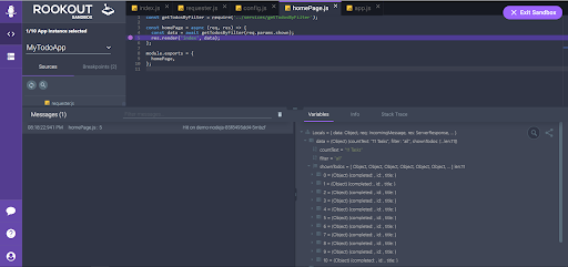 登録なしですぐに試せるRookoutの試用環境であるRookout Sandboxで公開しているデモ用のTo-Doアプリケーションを例にご説明します(To-Doアプリの動作はこちらでご確認ください)。このアプリケーションからフロントエンドに送信されるTo-Doリストの内容をすべて見たいなら、対応する行に「止まらないブレークポイント」を設定するだけです。これは、従来のようにローカルマシン上でブレークポイントを設定するのと何ら変わりありません。コードを改変することも、アプリを止めたり壊したりすることもなく、リモートアプリケーションからデータを取得できるのです。
