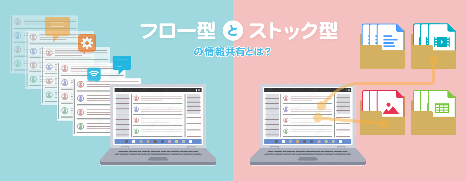 「フロー」型の情報共有とは、基本的にその場限りの情報共有で、情報を資産として蓄積(ストック)するのではなく、ある一定の短い期間に限定して情報を共有するということです。Slack以外には、電子メールやLINEも「フロー」型の情報共有の例といえます。これらは全て「会話」の内容を記録することで情報を共有するタイプのものといえます。