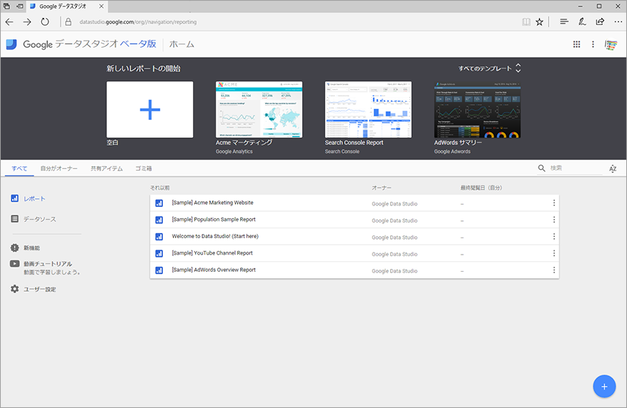 なんだかさっぱりとした印象ですね。現在は、Google データスタジオのベータ版です。完成版が出来上がるまでに、この画面も変更されていくのでしょうか。