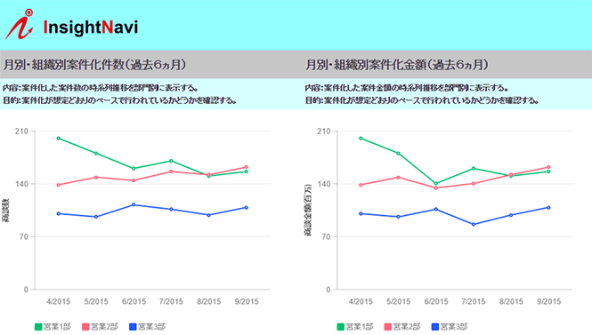 案件ステータスの変化を案件化、提案、内示といったイベントとして記録し、その件数や金額を時系列に分析することで、営業活動が適切なペースで行われているかどうかを判断することができます。