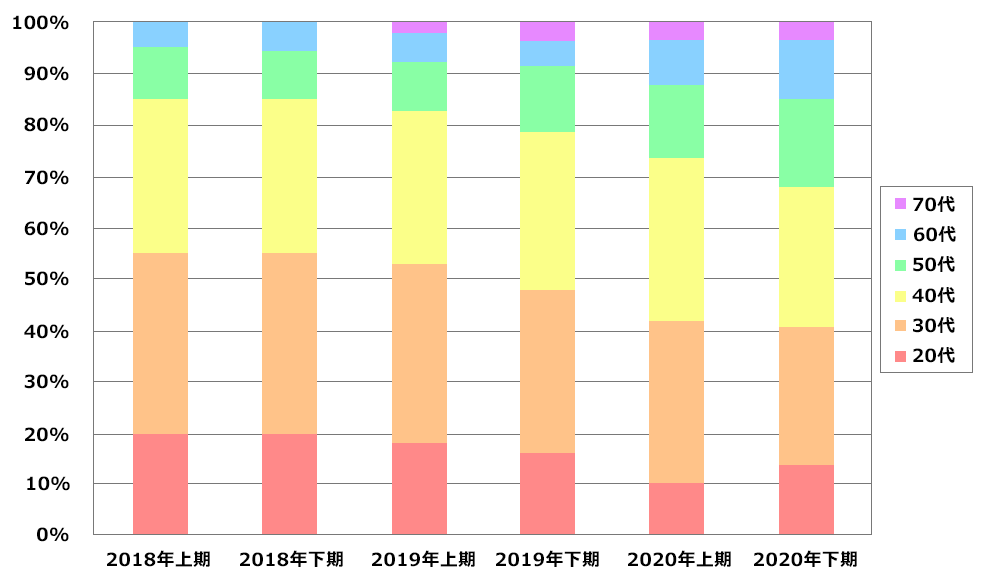 傾向として、30代、40代のシェアが大きいこと、また最近では50代、60代が少しずつではありますが増えてきていることも分かります。つまり、既存顧客層として30代、40代のセグメント(グループ)と、新規顧客層として50代、60代のセグメントが存在することがこの分析から見えてきます。