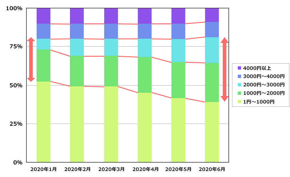もう1つの傾向として、1000円~2000円、2000円~3000円の中間価格帯の割合がこの半年間で増えつつあることが分かります。どちらの価格帯も2020年1月から徐々にではありますが増加傾向が続いています。