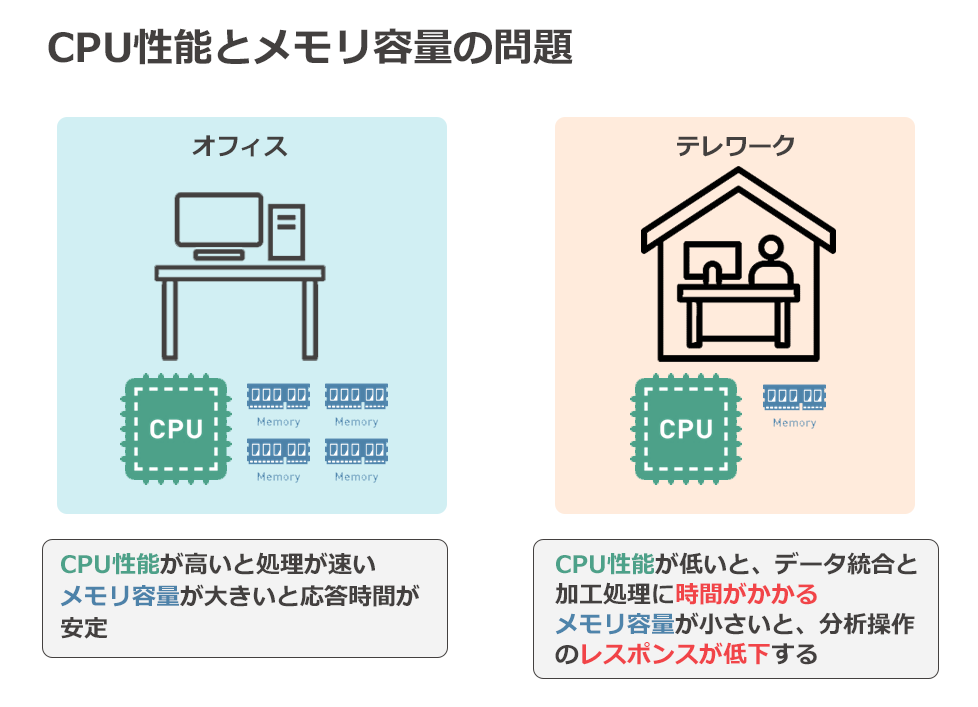 一方、テレワーク環境で使用するPCが、個人所有のPCや会社がテレワーク用に準備したPCである場合、CPU性能が低くなる可能性が高く、データの統合と加工に、オフィスで行っていた時の何倍も時間がかかってしまうことになります