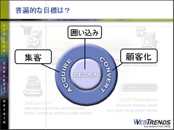 先のセッション「サイト運営におけるWeb解析の重要性」の最後でご紹介した通り、どのWebサイトにも共通する普遍的なビジネスゴールは、(1)見込客を費用対効果的に集め、(2)顧客に転換し、(3)リピーターとして囲い込む、ことにあります。